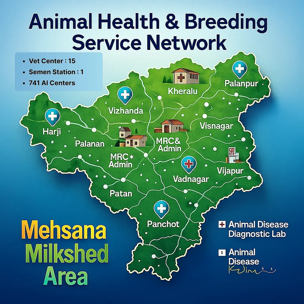 Milk production by dairy animals is a function of successful reproduction and total integration of animal health and nutrition. Veterinary services in animal breeding, feeding & health care management along with assured milk marketing at optimum prices by Mehsana District Co-operative Milk Producers’ Union Ltd, Mehsana popularly known as Dudhsagar Dairy. It makes Mehsana milk-shed number one in the dairy farming in the state/country.